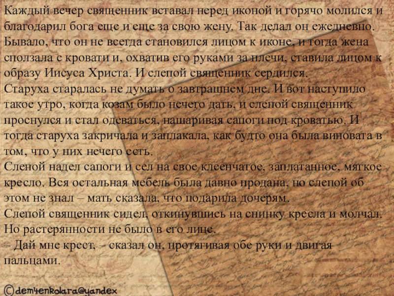 Слайд 43Каждый вечер священник вставал перед иконой и горячо молился и благодарил