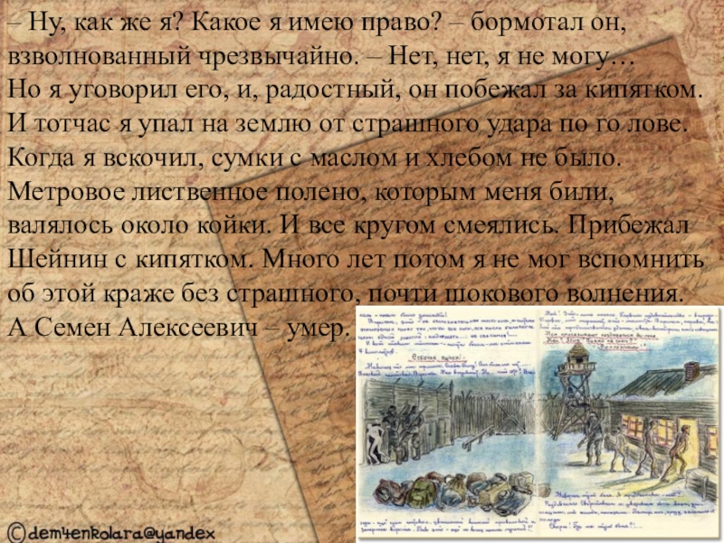 Когда я вскочил, сумки с маслом и хлебом не было. Метровое лиственное полено, которым меня били, валялось около койки. И все кругом смеялись. Прибежал Шейнин с кипятком. Много лет потом я не мог вспомнить об этой краже без страшного, почти шокового волнения.