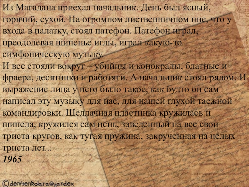И все стояли вокруг – убийцы и конокрады, блатные и фраера, десятники и работяги. А начальник стоял рядом. И выражение лица у него было такое, как будто он сам написал эту музыку для нас, для нашей глухой таежной командировки. Шеллачная пластинка кружилась и шипела, кружился сам пень, заведенный на все свои триста кругов, как тугая пружина, закрученная на целых триста лет...