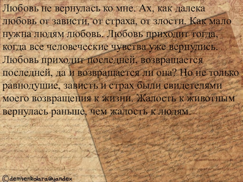 Слайд 22Любовь не вернулась ко мне. Ах, как далека любовь от зависти,