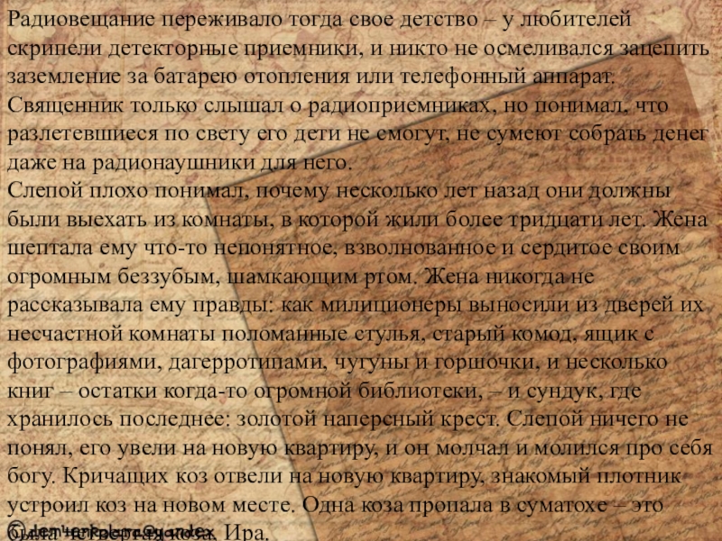 и никто не осмеливался зацепить заземление за батарею отопления или телефонный аппарат. Священник только слышал о радиоприемниках, но понимал, что разлетевшиеся по свету его дети не смогут, не сумеют собрать денег даже на радионаушники для него.