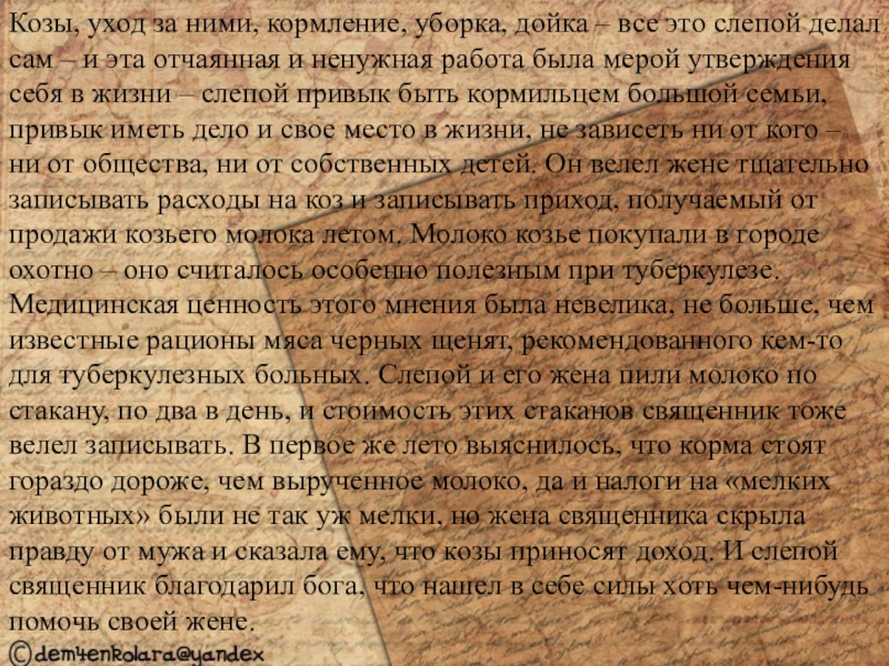 делал сам – и эта отчаянная и ненужная работа была мерой утверждения себя в жизни – слепой привык быть кормильцем большой семьи, привык иметь дело и свое место в жизни, не зависеть ни от кого – ни от общества, ни от собственных детей. Он велел жене тщательно записывать расходы на коз и записывать приход, получаемый от продажи козьего молока летом. Молоко козье покупали в городе охотно – оно считалось особенно полезным при туберкулезе. Медицинская ценность этого мнения была невелика, не больше, чем известные рационы мяса черных щенят, рекомендованного кем-то для туберкулезных больных. Слепой и его жена пили молоко по стакану, по два в день, и стоимость этих стаканов священник тоже велел записывать. В первое же лето выяснилось, что корма стоят гораздо дороже, чем вырученное молоко, да и налоги на «мелких животных» были не так уж мелки, но жена священника скрыла правду от мужа и сказала ему, что козы приносят доход. И слепой священник благодарил бога, что нашел в себе силы хоть чем-нибудь помочь своей жене.