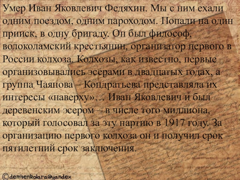 Слайд 8Умер Иван Яковлевич Федяхин. Мы с ним ехали одним поездом, одним
