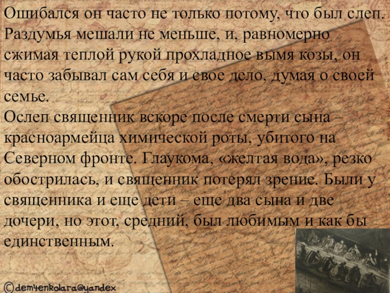 Ослеп священник вскоре после смерти сына – красноармейца химической роты, убитого на Северном фронте. Глаукома, «желтая вода», резко обострилась, и священник потерял зрение. Были у священника и еще дети – еще два сына и две дочери, но этот, средний, был любимым и как бы единственным.