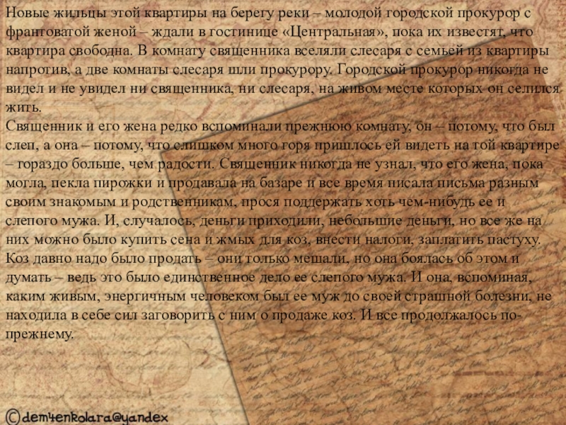 Слайд 39Новые жильцы этой квартиры на берегу реки – молодой городской прокурор