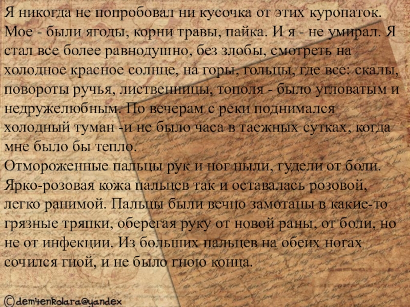 были ягоды, корни травы, пайка. И я - не умирал. Я стал все более равнодушно, без злобы, смотреть на холодное красное солнце, на горы, гольцы, где все: скалы, повороты ручья, лиственницы, тополя - было угловатым и недружелюбным. По вечерам с реки поднимался холодный туман -и не было часа в таежных сутках, когда мне было бы тепло.