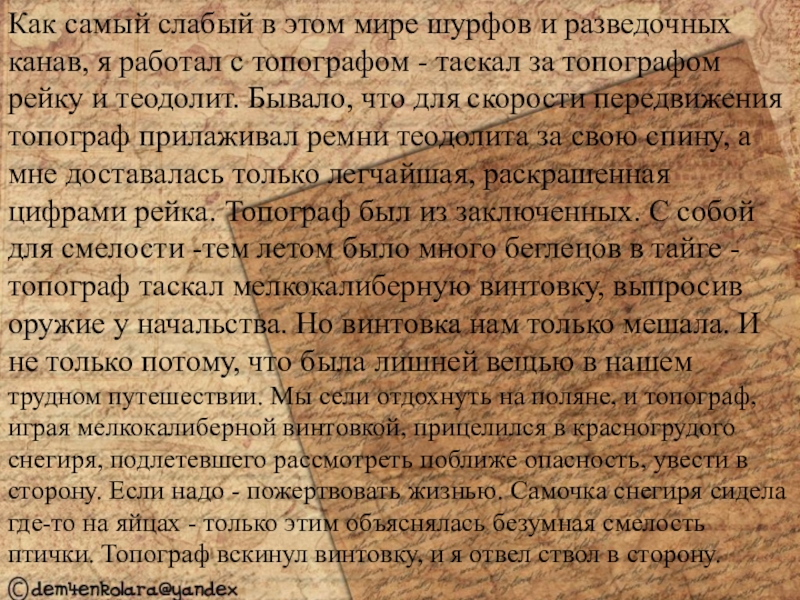 работал с топографом - таскал за топографом рейку и теодолит. Бывало, что для скорости передвижения топограф прилаживал ремни теодолита за свою спину, а мне доставалась только легчайшая, раскрашенная цифрами рейка. Топограф был из заключенных. С собой для смелости -тем летом было много беглецов в тайге - топограф таскал мелкокалиберную винтовку, выпросив оружие у начальства. Но винтовка нам только мешала. И не только потому, что была лишней вещью в нашем трудном путешествии. Мы сели отдохнуть на поляне, и топограф, играя мелкокалиберной винтовкой, прицелился в красногрудого снегиря, подлетевшего рассмотреть поближе опасность, увести в сторону. Если надо - пожертвовать жизнью. Самочка снегиря сидела где-то на яйцах - только этим объяснялась безумная смелость птички. Топограф вскинул винтовку, и я отвел ствол в сторону.