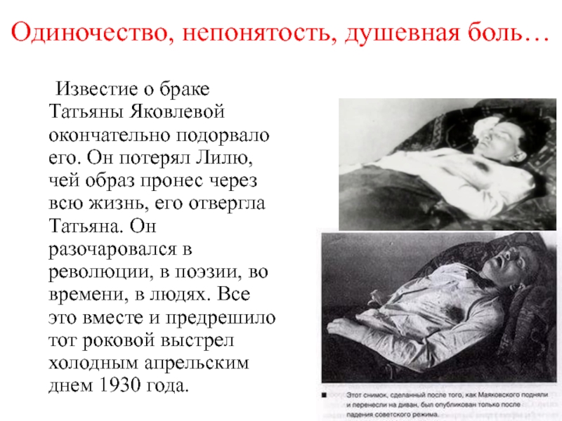 Он потерял Лилю, чей образ пронес через всю жизнь, его отвергла Татьяна. Он разочаровался в революции, в поэзии, во времени, в людях. Все это вместе и предрешило тот роковой выстрел холодным апрельским днем 1930 года.