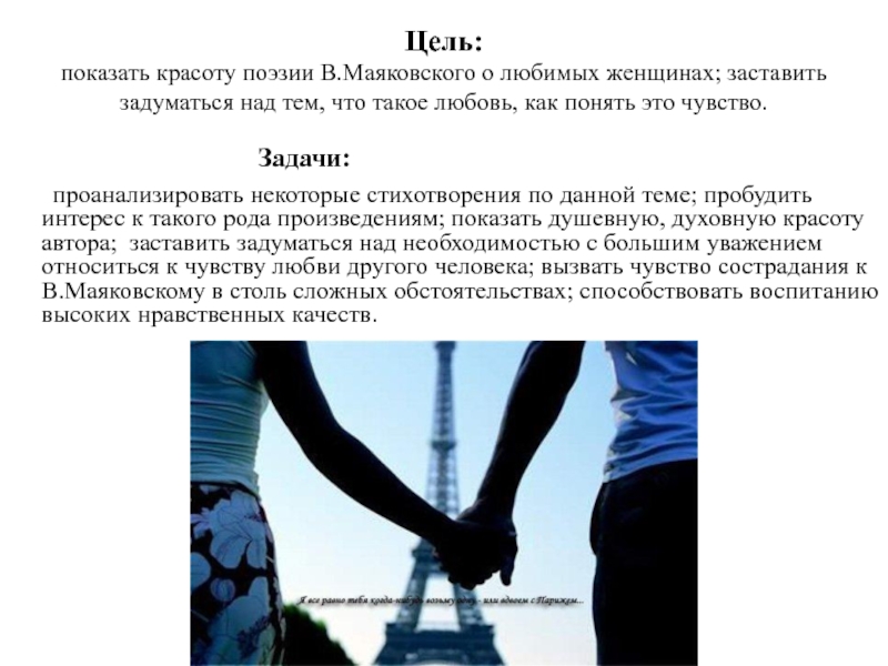 проанализировать некоторые стихотворения по данной теме; пробудить интерес к такого рода произведениям; показать душевную, духовную красоту автора; заставить задуматься над необходимостью с большим уважением относиться к чувству любви другого человека; вызвать чувство сострадания к В.Маяковскому в столь сложных обстоятельствах; способствовать воспитанию высоких нравственных качеств.
