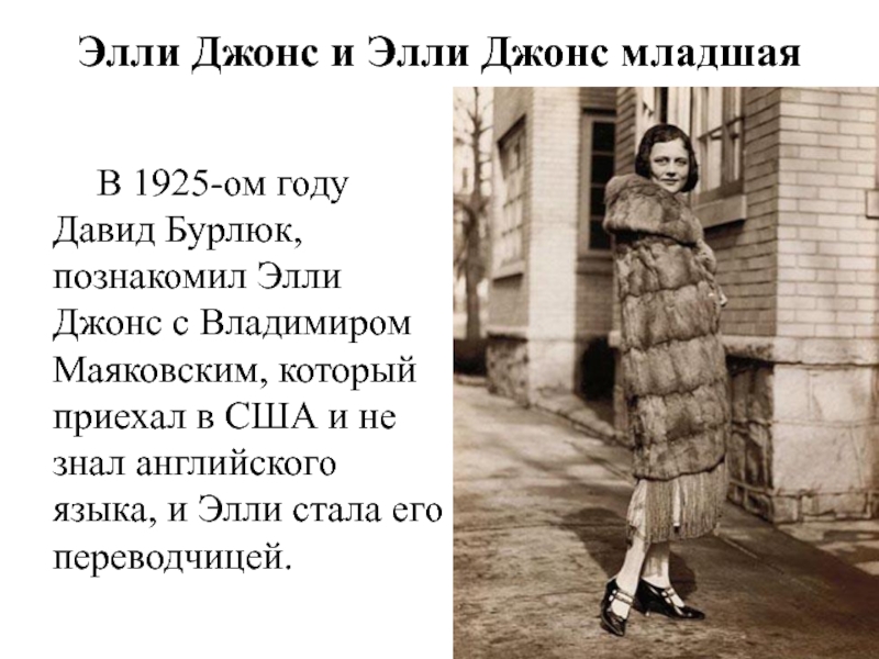 Элли Джонс с Владимиром Маяковским, который приехал в США и не знал английского языка, и Элли стала его переводчицей.