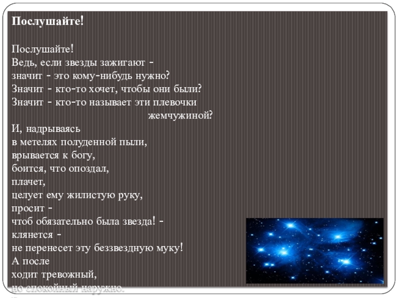 Стихотворение "Послушайте!"-развернутая метафора, имеющая большой иносказательный смысл. Кроме насущного хлеба, нам нужна еще и мечта, большая жизненная цель, духовность, красота. Нам нужны звезды -"жемчужины", а не звезды-"плевочки".