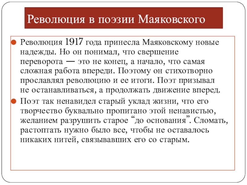 что свершение переворота — это не конец, а начало, что самая сложная работа впереди. Поэтому он стихотворно прославлял революцию и ее итоги. Поэт призывал не останавливаться, а продолжать движение вперед.