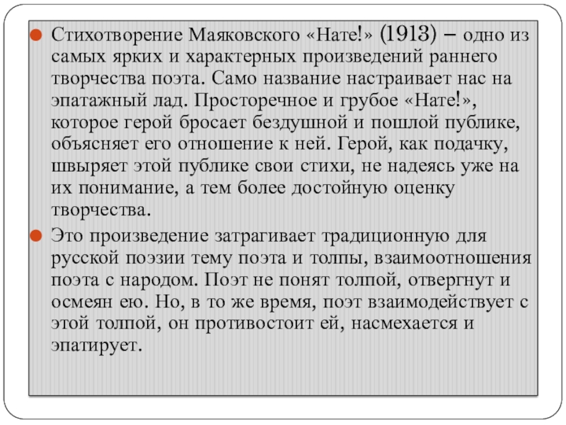 произведений раннего творчества поэта. Само название настраивает нас на эпатажный лад. Просторечное и грубое «Нате!», которое герой бросает бездушной и пошлой публике, объясняет его отношение к ней. Герой, как подачку, швыряет этой публике свои стихи, не надеясь уже на их понимание, а тем более достойную оценку творчества.