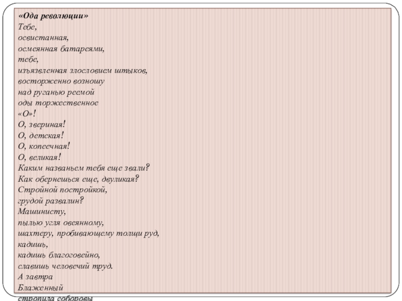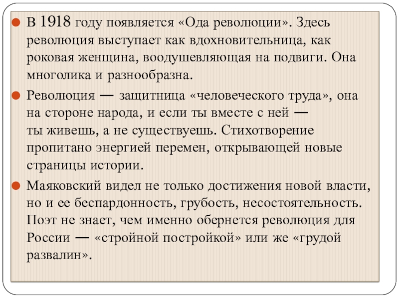 Слайд 15В 1918 году появляется «Ода революции». Здесь революция выступает как вдохновительница, как