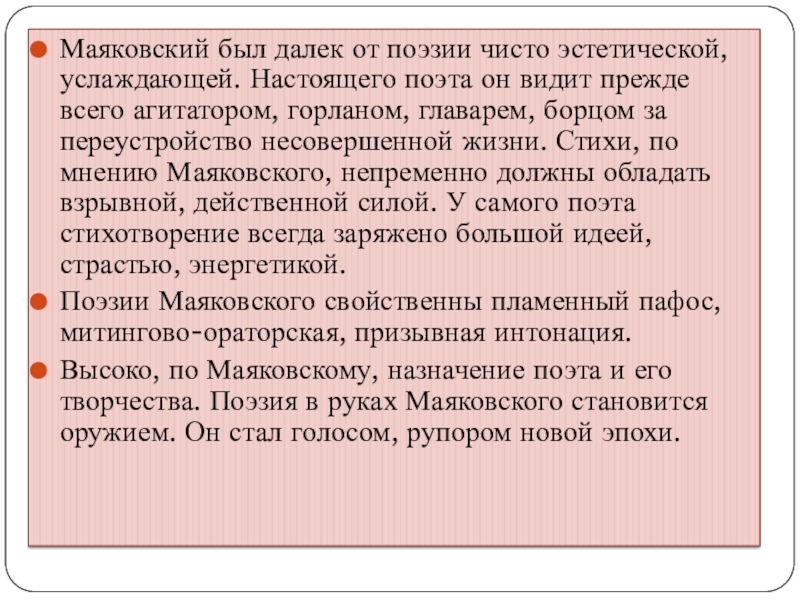 Слайд 3Маяковский был далек от поэзии чисто эстетической, услаждающей. Настоящего поэта он