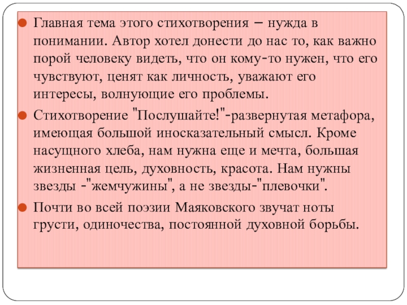 Слайд 7Главная тема этого стихотворения – нужда в понимании. Автор хотел донести