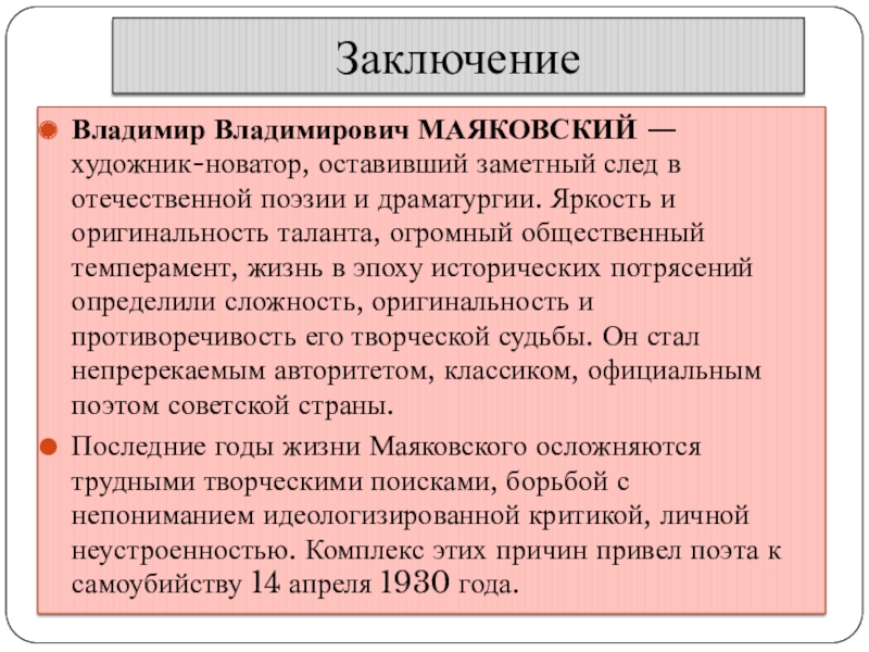 Последние годы жизни Маяковского осложняются трудными творческими поисками, борьбой с непониманием идеологизированной критикой, личной неустроенностью. Комплекс этих причин привел поэта к самоубийству 14 апреля 1930 года.