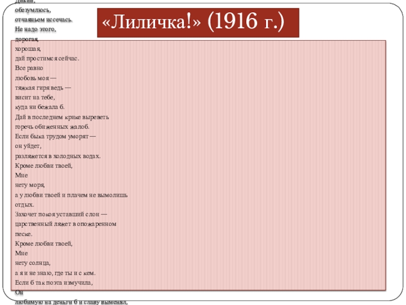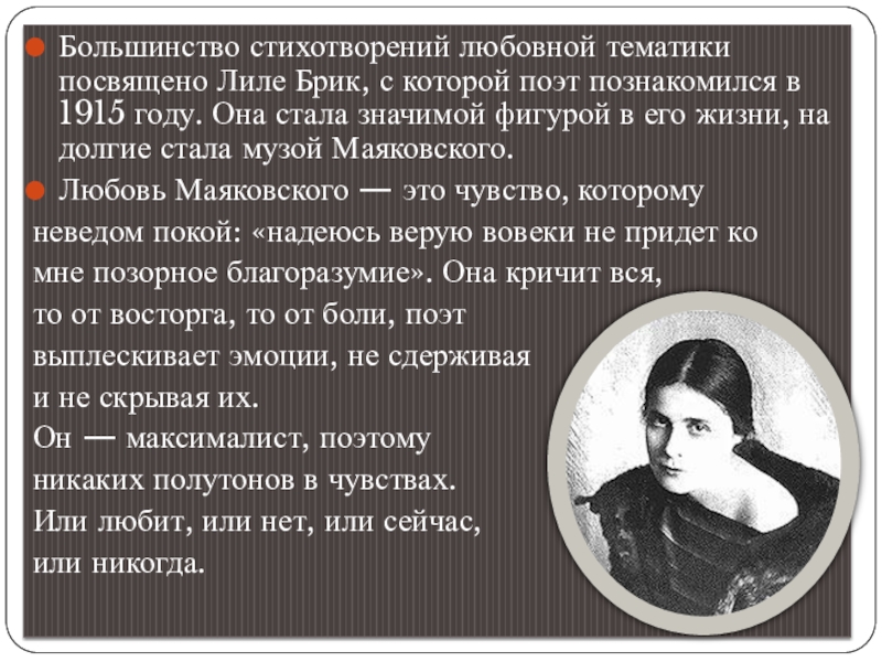 Слайд 10Большинство стихотворений любовной тематики посвящено Лиле Брик, с которой поэт познакомился