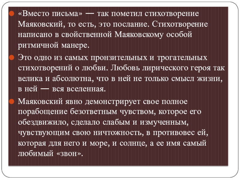 Слайд 12«Вместо письма» — так пометил стихотворение Маяковский, то есть, это послание.