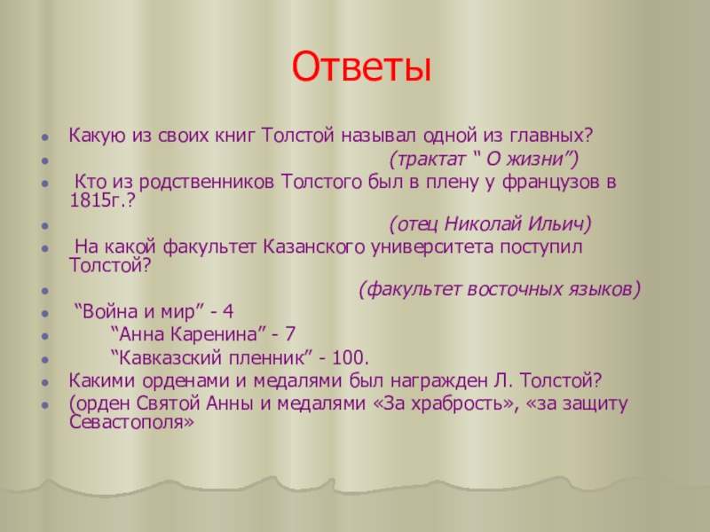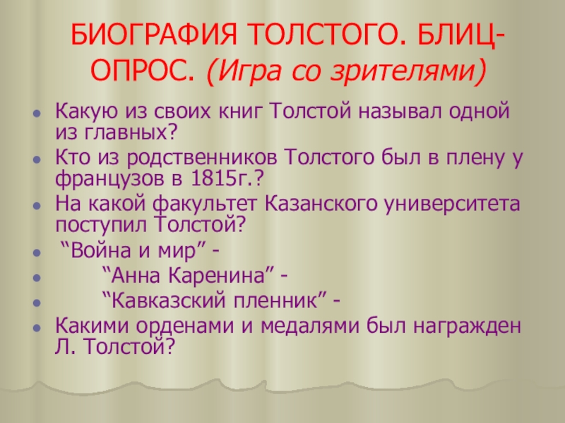 Слайд 10БИОГРАФИЯ ТОЛСТОГО. БЛИЦ- ОПРОС. (Игра со зрителями)