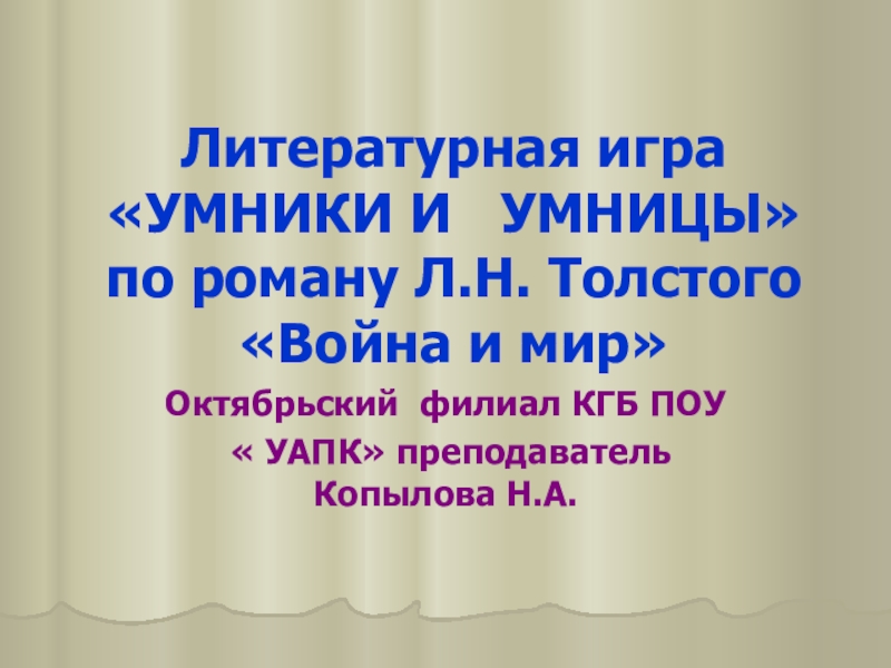 Слайд 1Литературная игра «УМНИКИ И УМНИЦЫ» по роману Л.Н. Толстого «Война