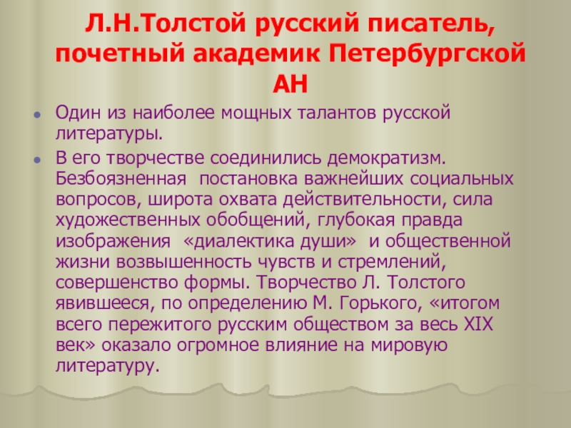 Слайд 3Л.Н.Толстой русский писатель, почетный академик Петербургской АН