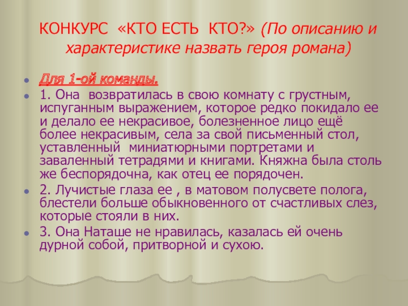 Слайд 12КОНКУРС «КТО ЕСТЬ КТО?» (По описанию и характеристике назвать героя романа)