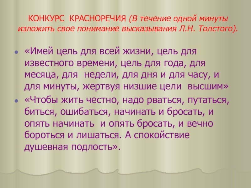 Слайд 7КОНКУРС КРАСНОРЕЧИЯ (В течение одной минуты изложить свое понимание высказывания Л.Н.
