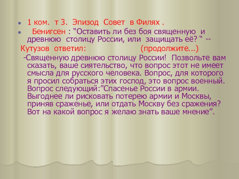 -Священную древнюю столицу России! Позвольте вам сказать, ваше сиятельство, что вопрос этот не имеет смысла для русского человека. Вопрос, для которого я просил собраться этих господ, это вопрос военный. Вопрос следующий:”Спасенье России в армии. Выгоднее ли рисковать потерею армии и Москвы, приняв сраженье, или отдать Москву без сражения? Вот на какой вопрос я желаю знать ваше мнение”.