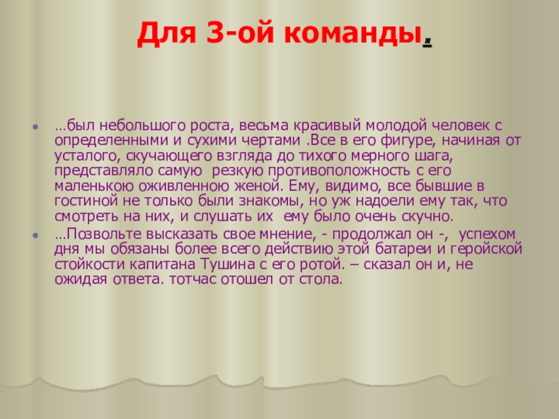 …Позвольте высказать свое мнение, - продолжал он -, успехом дня мы обязаны более всего действию этой батареи и геройской стойкости капитана Тушина с его ротой. – сказал он и, не ожидая ответа. тотчас отошел от стола.