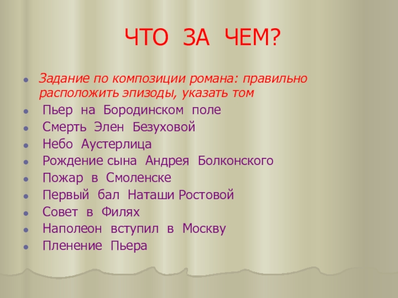 Задание по композиции романа: правильно расположить эпизоды, указать том