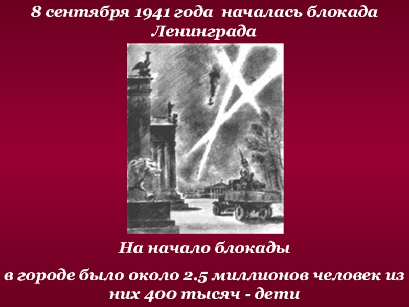 8 сентября 1941 года началась блокада ЛенинградаНа начало блокады в городе было около 2.5 миллионов человек из