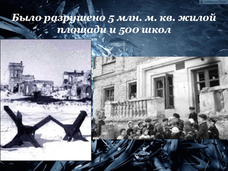 Слайд 29Было разрушено 5 млн. м. кв. жилой площади и 500 школ