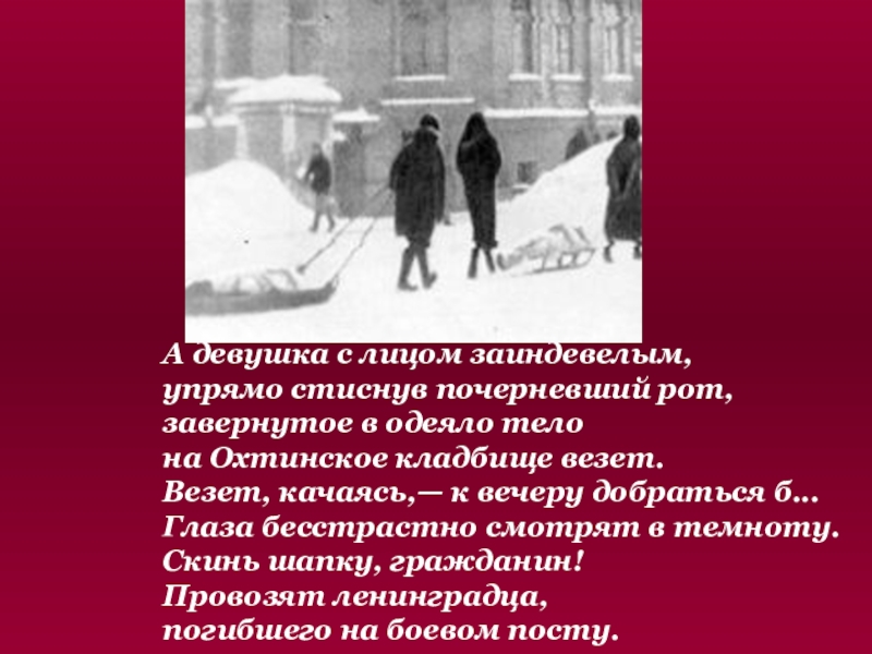 А девушка с лицом заиндевелым,упрямо стиснув почерневший рот,завернутое в одеяло телона Охтинское кладбище везет.Везет, качаясь,— к вечеру