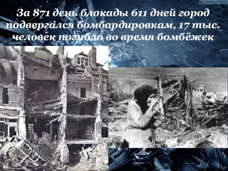 Слайд 25За 871 день блокады 611 дней город подвергался бомбардировкам, 17 тыс.