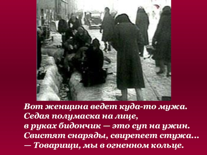 Вот женщина ведет куда-то мужа.Седая полумаска на лице,в руках бидончик — это суп на ужин.Свистят снаряды, свирепеет