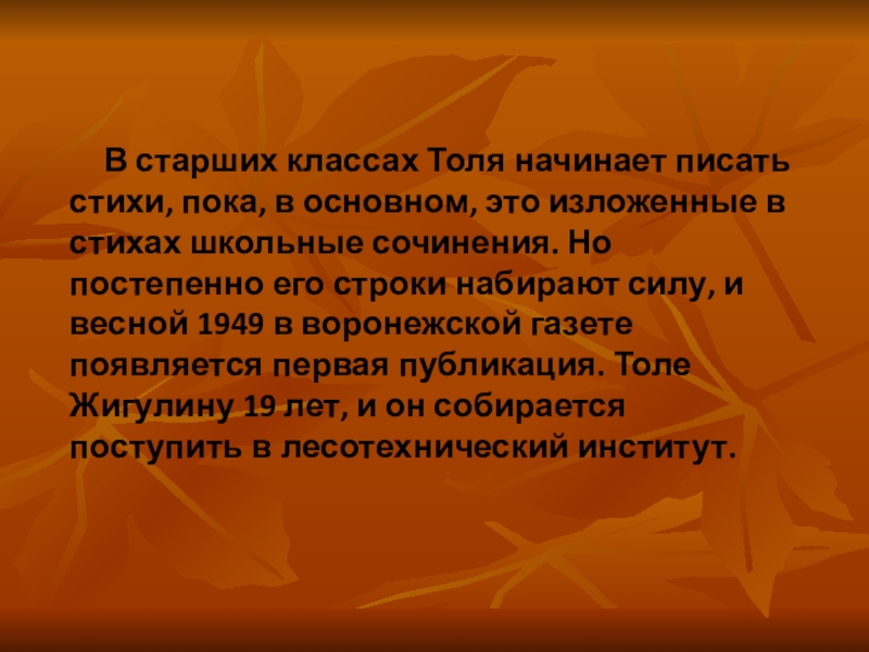 пока, в основном, это изложенные в стихах школьные сочинения. Но постепенно его строки набирают силу, и весной 1949 в воронежской газете появляется первая публикация. Толе Жигулину 19 лет, и он собирается поступить в лесотехнический институт.