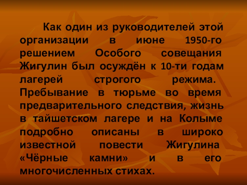 решением Особого совещания Жигулин был осуждён к 10-ти годам лагерей строгого режима. Пребывание в тюрьме во время предварительного следствия, жизнь в тайшетском лагере и на Колыме подробно описаны в широко известной повести Жигулина «Чёрные камни» и в его многочисленных стихах.