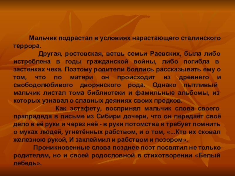 Другая, ростовская, ветвь семьи Раевских, была либо истреблена в годы гражданской войны, либо погибла в застенках чека. Поэтому родители боялись рассказывать ему о том, что по матери он происходит из древнего и свободолюбивого дворянского рода. Однако пытливый мальчик листал тома библиотеки и фамильные альбомы, из которых узнавал о славных деяниях своих предков.