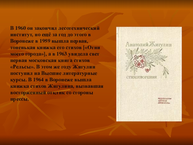 этого в Воронеже в 1959 вышла первая, тоненькая книжка его стихов [«Огни моего города»], а в 1963 увидела свет первая московская книга стихов «Рельсы». В этом же году Жигулин поступил на Высшие литературные курсы. В 1964 в Воронеже вышла книжка стихов Жигулина, вызвавшая восторженный отклик со стороны прессы.
