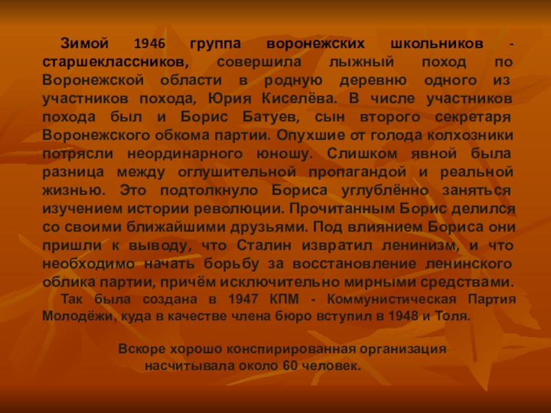 Воронежской области в родную деревню одного из участников похода, Юрия Киселёва. В числе участников похода был и Борис Батуев, сын второго секретаря Воронежского обкома партии. Опухшие от голода колхозники потрясли неординарного юношу. Слишком явной была разница между оглушительной пропагандой и реальной жизнью. Это подтолкнуло Бориса углублённо заняться изучением истории революции. Прочитанным Борис делился со своими ближайшими друзьями. Под влиянием Бориса они пришли к выводу, что Сталин извратил ленинизм, и что необходимо начать борьбу за восстановление ленинского облика партии, причём исключительно мирными средствами.