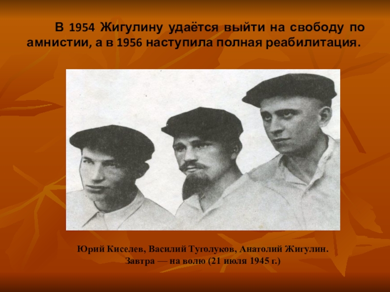 Слайд 12 В 1954 Жигулину удаётся выйти на свободу по