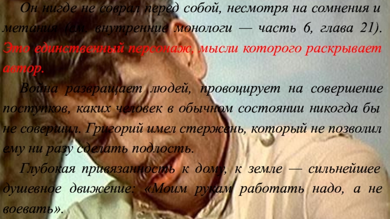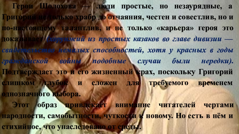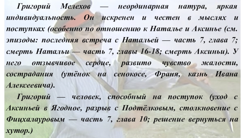 Слайд 10Григорий Мелехов — неординарная натура, яркая индивидуальность. Он искренен и честен
