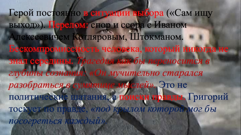 ссора с Иваном Алексеевичем Котляровым, Штокманом. Бескомпромиссность человека, который никогда не знал середины. Трагедия как бы переносится в глубины сознания: «Он мучительно старался разобраться в сумятице мыслей». Это не политические шатания, а поиски правды. Григорий тоскует по правде, «под крылом которой мог бы посогреться каждый».