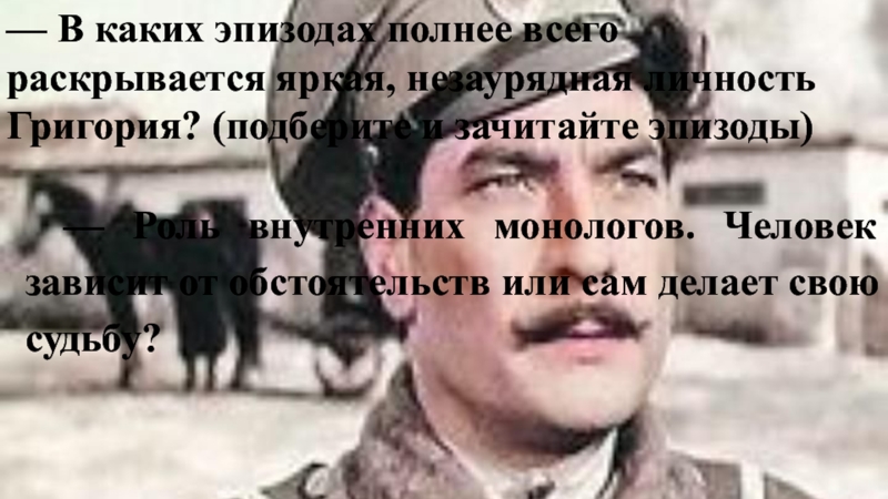 Слайд 11— В каких эпизодах полнее всего раскрывается яркая, незаурядная личность Григория?