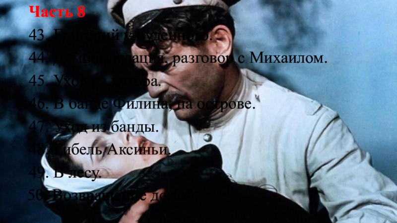 Григорий — человек, способный на поступок (уход с Аксиньей в Ягодное, разрыв с Подтёлковым, столкновение с Фицхалауровым — часть 7, глава 10; решение вернуться на хутор.)