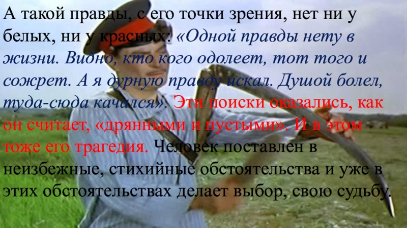 ни у красных: «Одной правды нету в жизни. Видно, кто кого одолеет, тот того и сожрет. А я дурную правду искал. Душой болел, туда-сюда качался». Эти поиски оказались, как он считает, «дрянными и пустыми». И в этом тоже его трагедия. Человек поставлен в неизбежные, стихийные обстоятельства и уже в этих обстоятельствах делает выбор, свою судьбу.