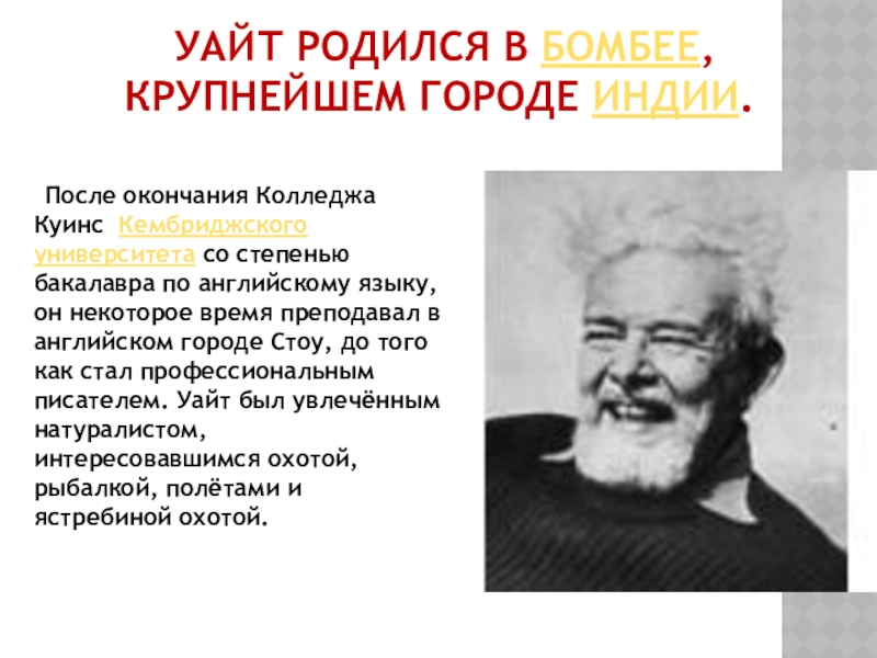 Слайд 8 УАЙТ РОДИЛСЯ В БОМБЕЕ, КРУПНЕЙШЕМ ГОРОДЕ ИНДИИ.
