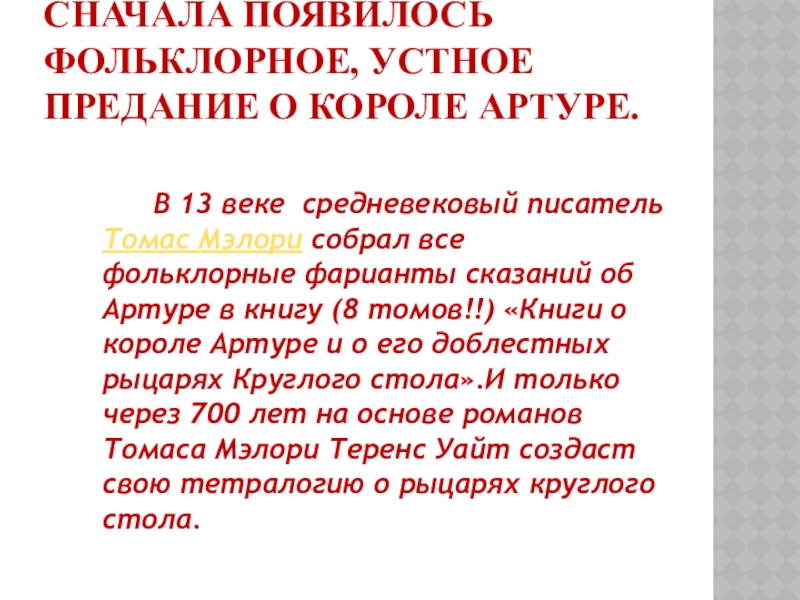Слайд 15СНАЧАЛА ПОЯВИЛОСЬ ФОЛЬКЛОРНОЕ, УСТНОЕ ПРЕДАНИЕ О КОРОЛЕ АРТУРЕ.