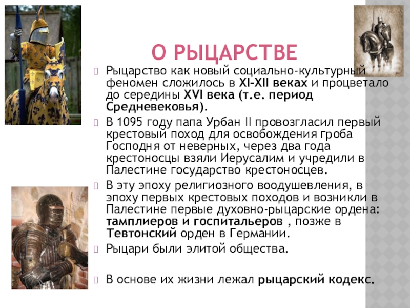 В эту эпоху религиозного воодушевления, в эпоху первых крестовых походов и возникли в Палестине первые духовно-рыцарские ордена: тамплиеров и госпитальеров , позже в Тевтонский орден в Германии.